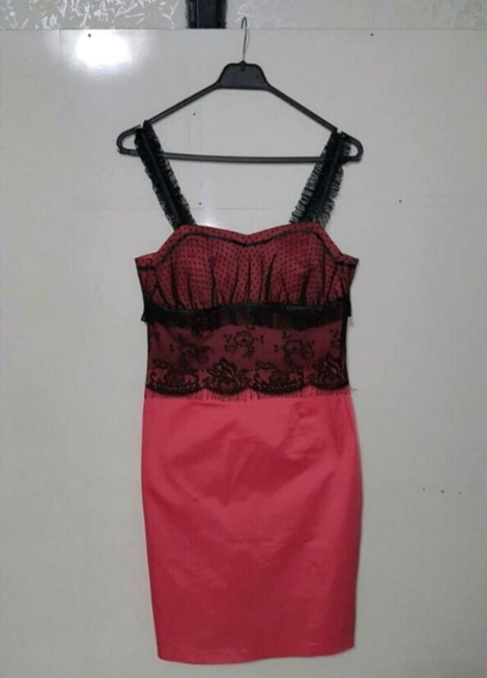 Dantel işlemeli detaylara sahip, askısız yaka ve dar kesimli, pembe mini elbise. Cesur gotik tarz için romantik akşam buluşmalarında ideal.