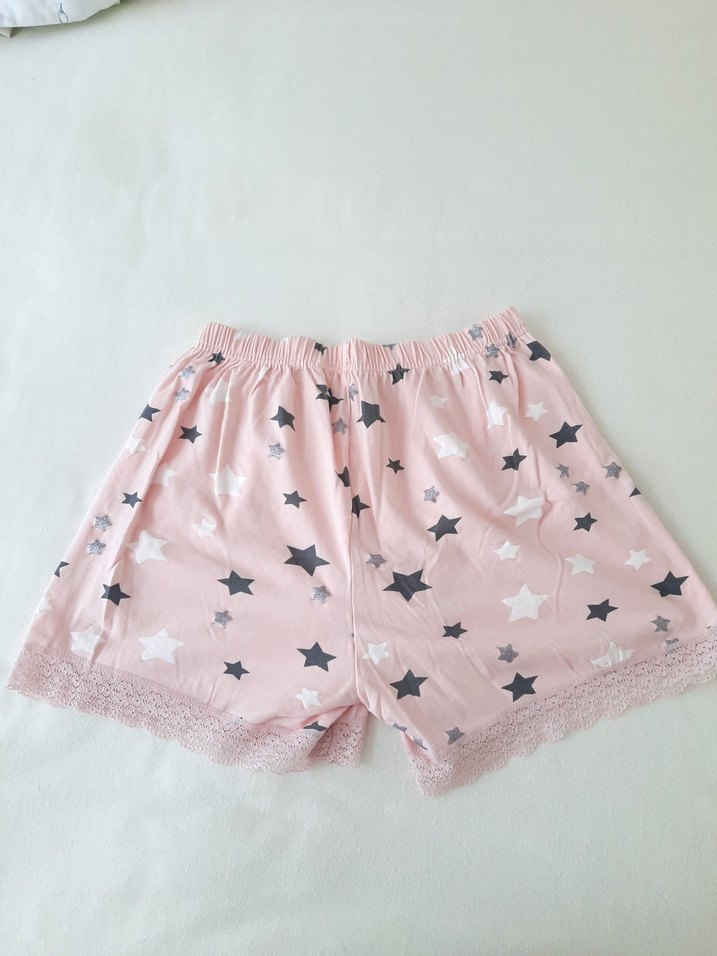 hiç kullanılmadı. Yumuşak pamuktan yapılmış, dantel detaylı ve yıldız desenli pembe, bol kesim mini şort. Günlük kullanım için uygundur.