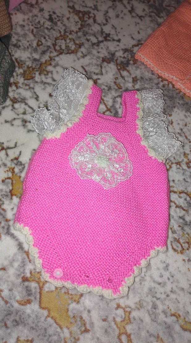 Dantel detaylı, renkli nakışlı pembe bebek kız tulumu. Yumuşak ve narin tasarım.