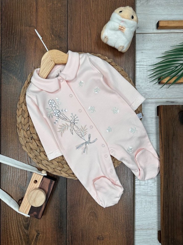 Dantel Detaylı Pembe Nakışlı Bebek Tulum