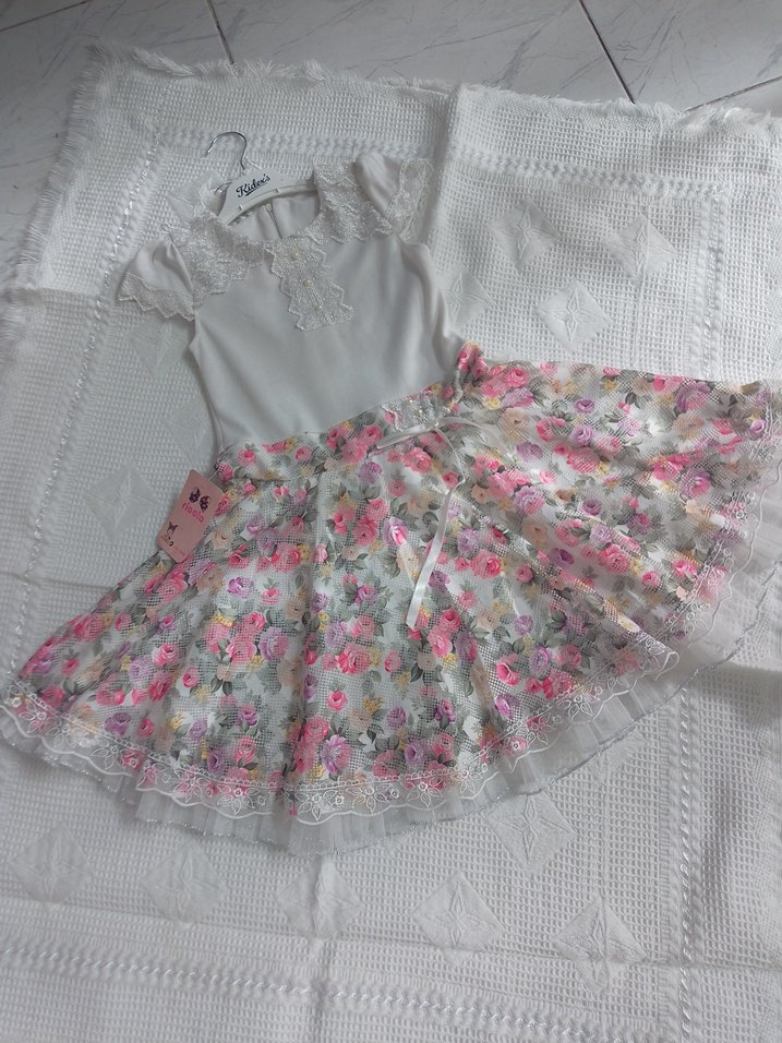 Yumuşak triko kumaştan, dantel detaylı, pastel pembe nakışlı çiçek desenli bol kesim bohem kız elbisesi. 6 ve 8 yas