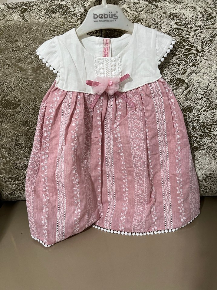 Pembe nakışlı ve dantel detaylı kız elbisesi. Yumuşak pamuktan, kısa kollu ve bol kesimli, pastel tonlarda bohem tarzda.