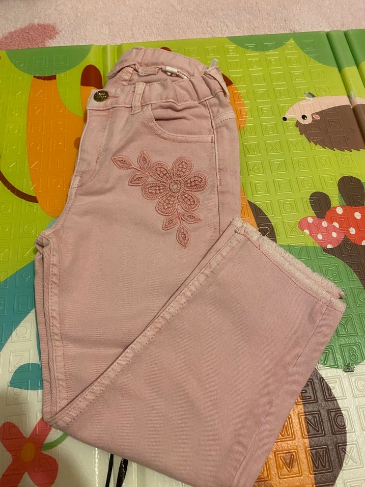 Pembe renkli, nakış işlemeli ve dantel detaylı kız pantolonu. Bohem tarzda, rahat kesim ve tekstil malzemeden üretilmiştir.