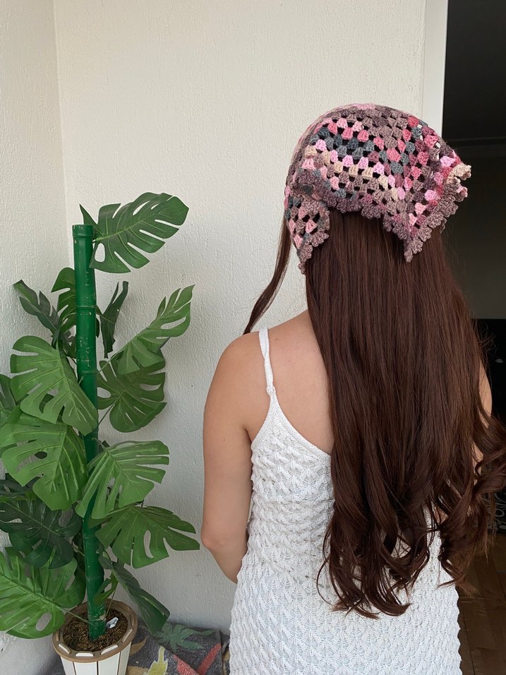 Pastel pembe renkli, dantel detaylı örgü bandana, bohem ve retro tarzlar için uygun.