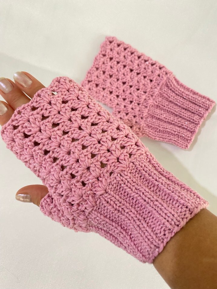 Dantel detaylı, pembe örgü eldivenler. Parmaksız yapısıyla bohem ve retro tarz sunar.