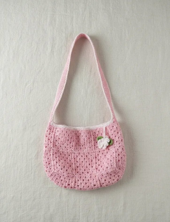 Pastel pembe renkli, dantel detaylı örgü çanta, sade ve bohem tarzda, günlük kullanıma uygun.