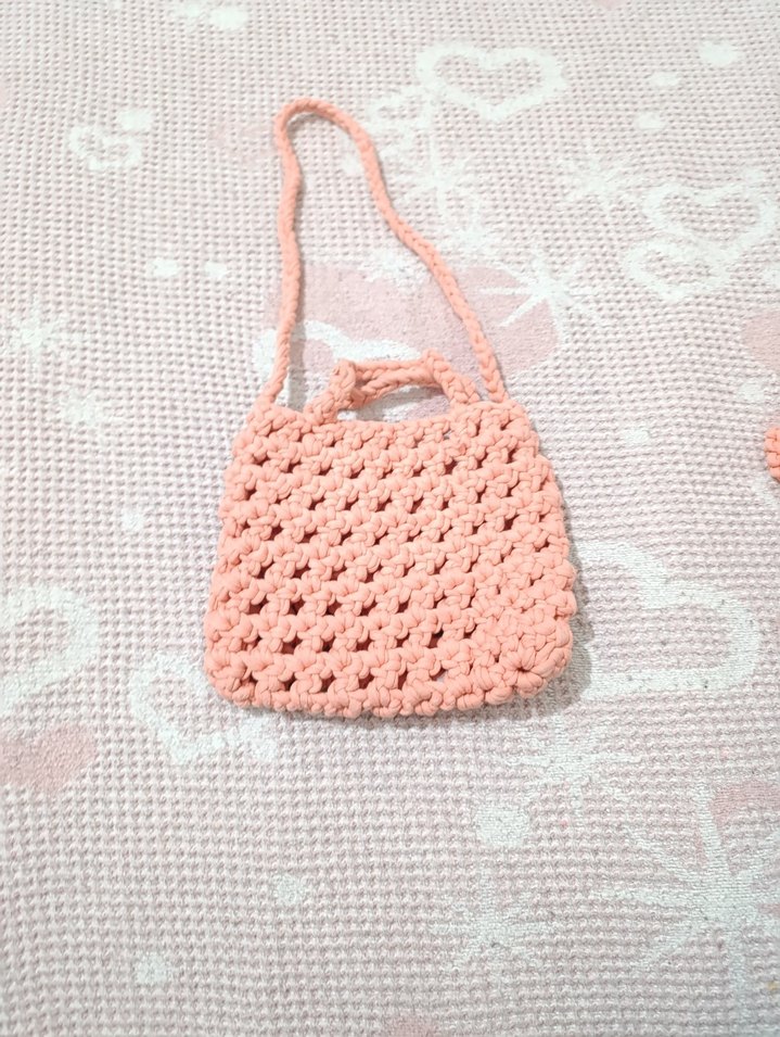 Pastel pembe renkli, dantel detaylı ve sade desenli örgü kadın çantasıdır. Günlük kullanıma uygun minimal ve temel tarzda, uzun askılıdır.