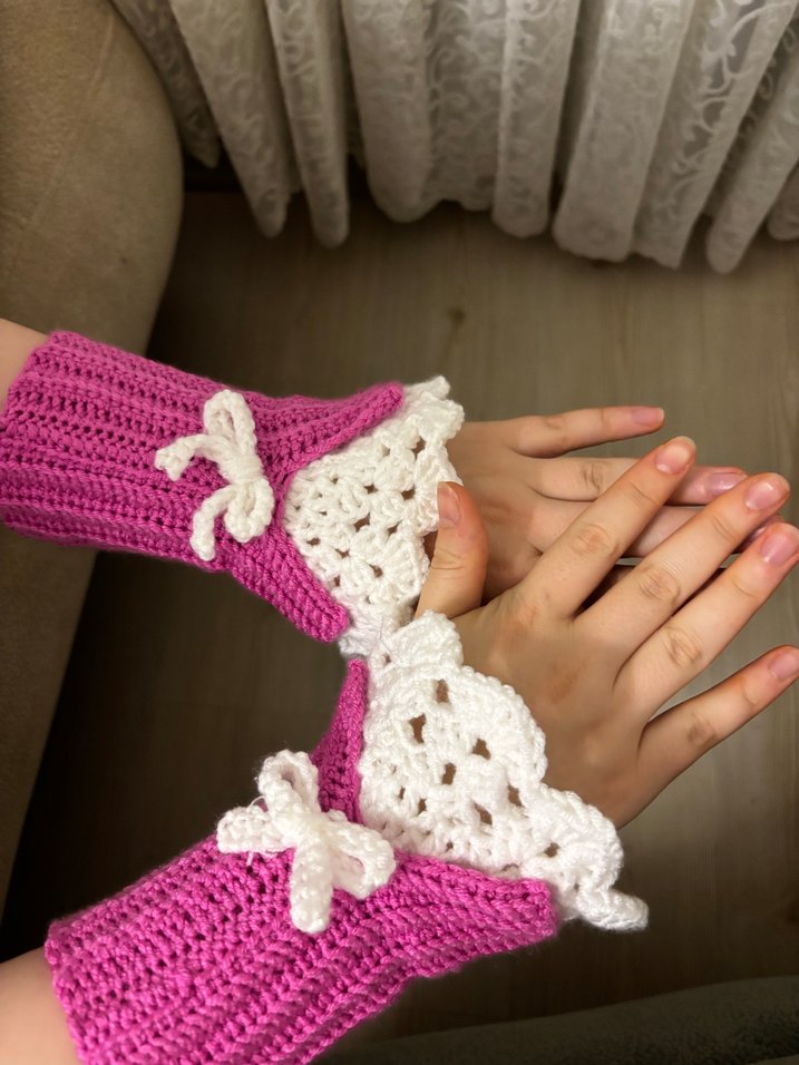 Pembe örgü kadın eldivenler, beyaz dantel detayları ve fiyonklarla süslenmiş. Rahat ve bohem tarzda, renkli retro görünüm için uygun.