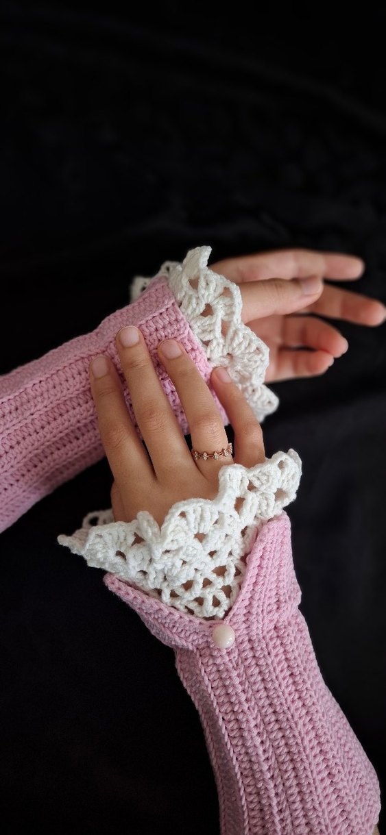 Pembe örgü kadın eldiveni, beyaz dantel ve inci düğme detaylıdır. Yumuşak ve rahat, vintage gotik tarzda.