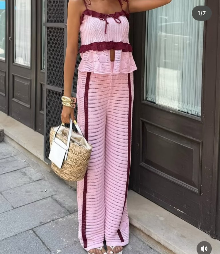 Dantel detaylı, bohem tarzda pembe örme uzun pantolon. Rahat kesimi ve pastel renkleriyle günlük şık bir görünüm sunar.