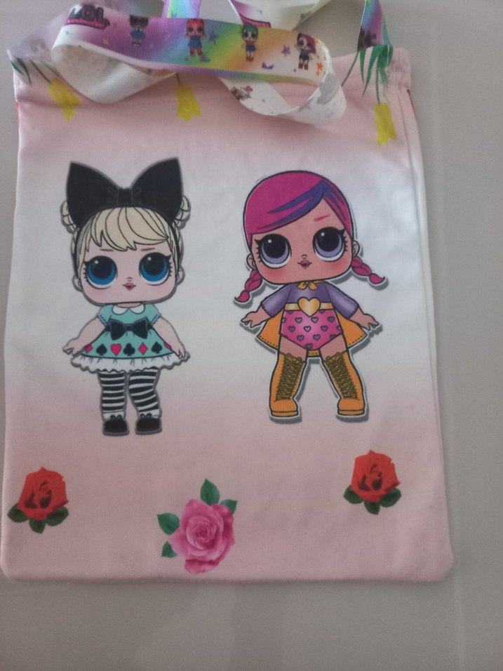 Pastel pembe renkli, pop kültür desenli, dantel ve çiçek detaylı, bohem ve retro tarzda kız çantası.