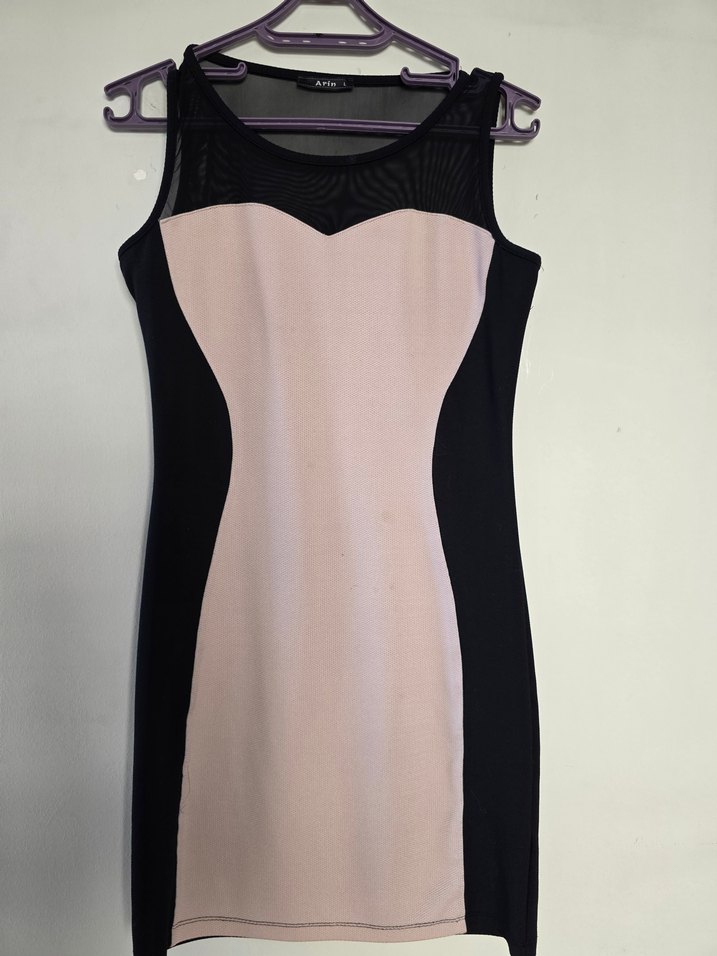 Askısız, dantel detaylı yakası ve siyah yan panelleri olan pastel pembe, vücuda oturan midi elbise. Gotik tarzda şık bir görünüm sunar.