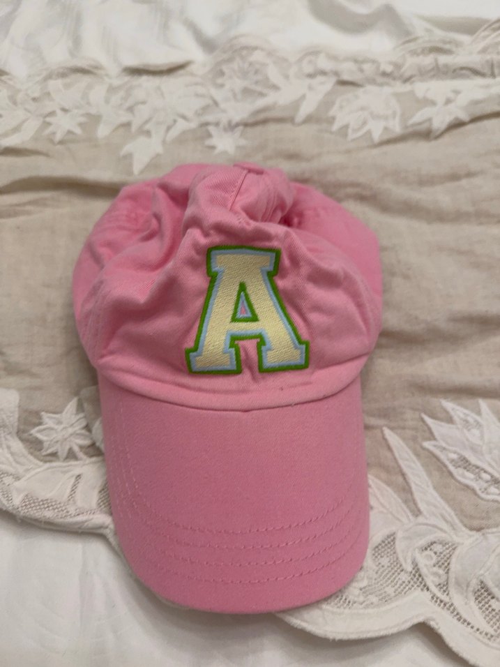 Pembe renkli, yumuşak kumaştan yapılmış, önünde büyük 'A' harfi ve dantel detayı bulunan spor tarzda şapka.