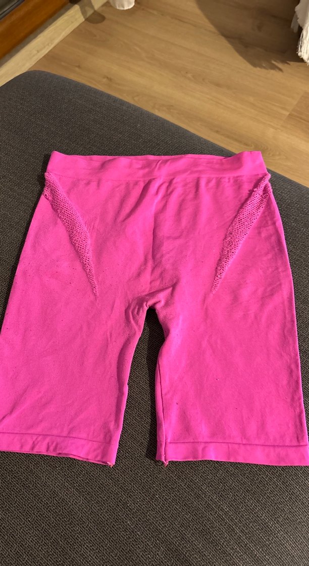Dantel detaylı, pembe, esnek sentetik kumaştan yapılmış taytMidi boy ve parlak yüzey, spor ve sokak tarzına uygun.