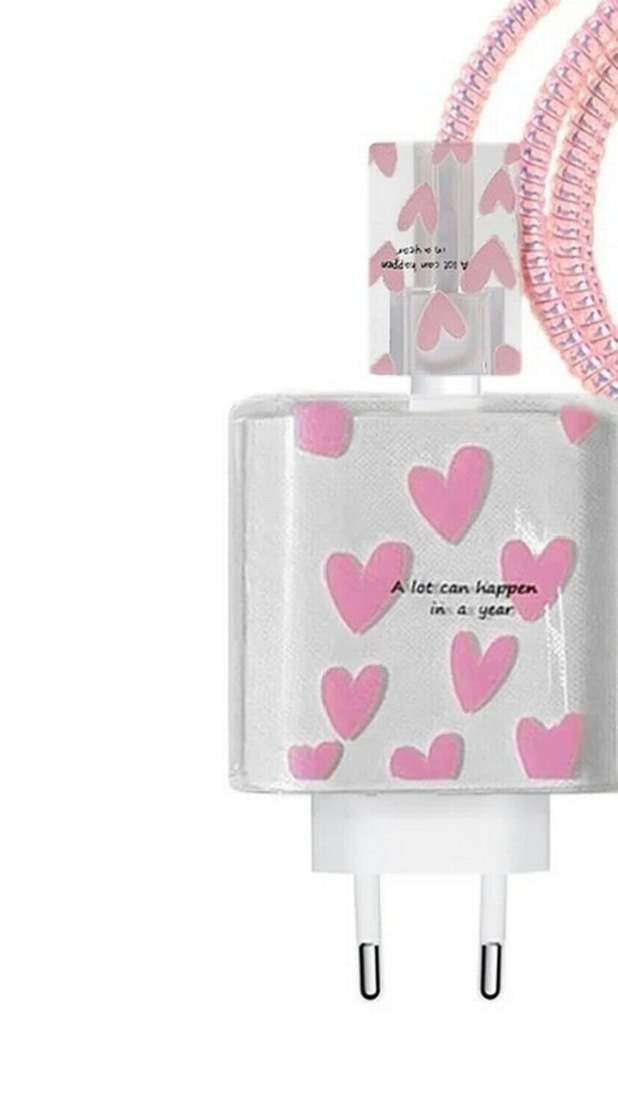 Dantel detaylı, pastel pembe renkte, kalp desenli ve "A lot can happen in a year" yazılı çağdaş telefon şarj adaptörü.