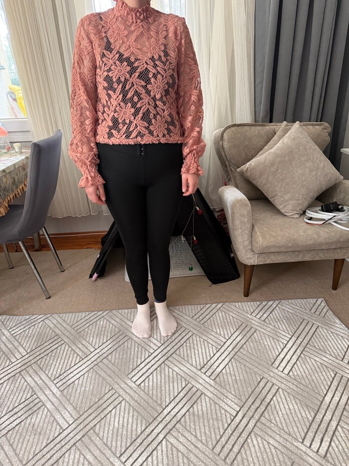 Dantel Detaylı Pembe Triko Bluz Uzun kollu, yüksek yakalı ve dantel detaylı pembe triko bluz, Paris tarzı normcore şıklığıyla trend bir günlük kullanım sunar. L Bedendir Hiçbir Kusuru Yoktur