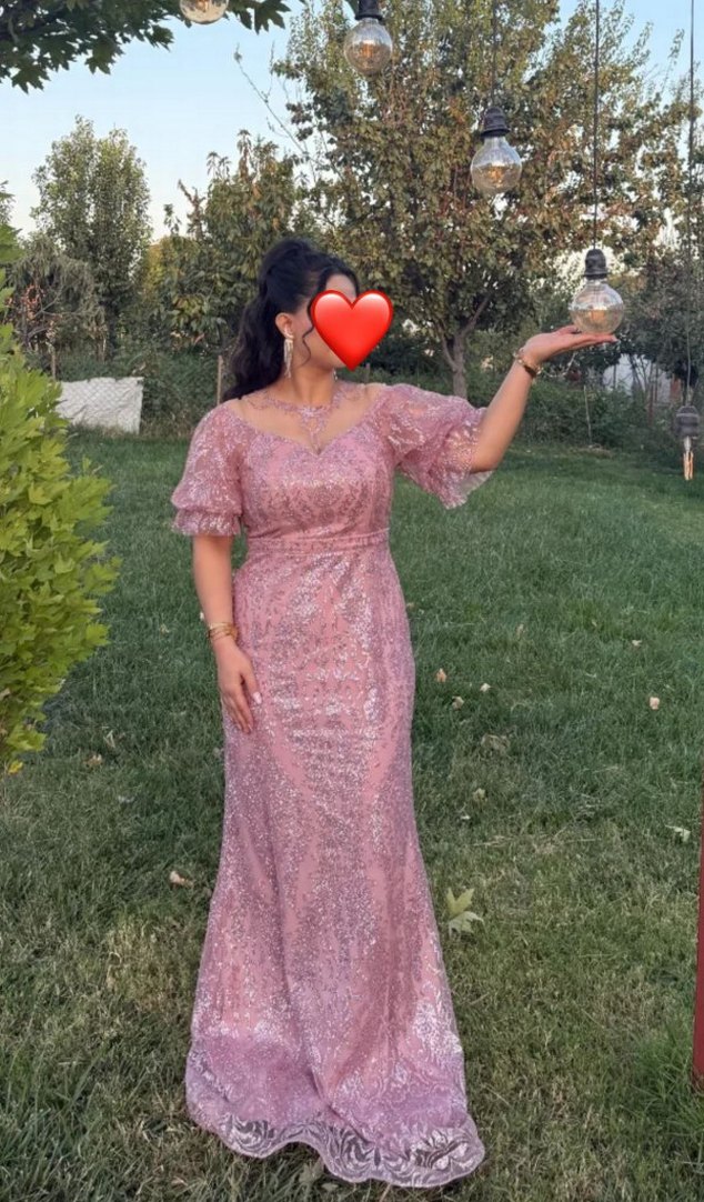 Uzun, v yaka, kısa kabarık kollu, dantel detaylı pembe abiye elbise. Hafif tie-dye deseniyle bohem ve retro tarzı bir arada sunar. sadece bir kere giyildi
