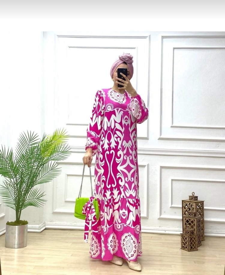 Renkli pembe uzun elbise, dantel detayları ve bisiklet yaka ile bol kesim bohem tarzını yansıtıyor.