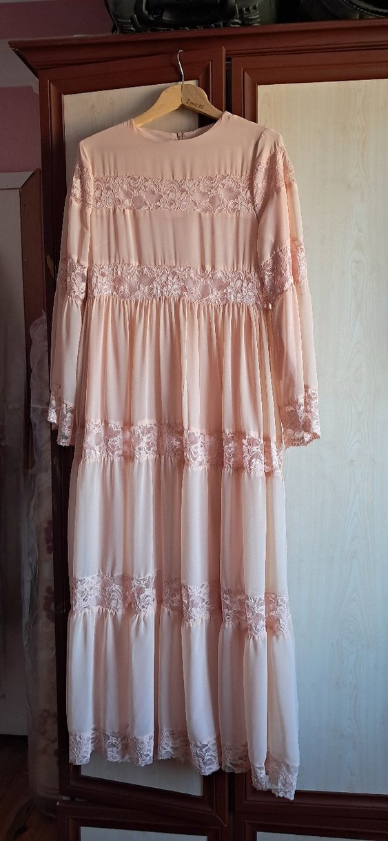 Dantel detaylı, tek renk pembe uzun elbise. İpek gibi dokusu ve salaş kesimi ile bohem tarzda. 2 kez kullanıldı temizdir ve hiçbir kusuru yoktur.