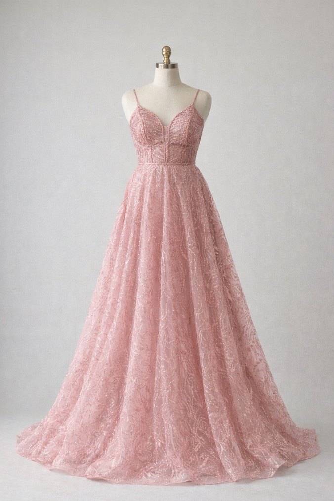 Dantel detaylı, ince askılı ve V yakalı pembe uzun gelinlik, modern klasik ve gösterişli şıklığı bir araya getirir. 1 defa giyildi