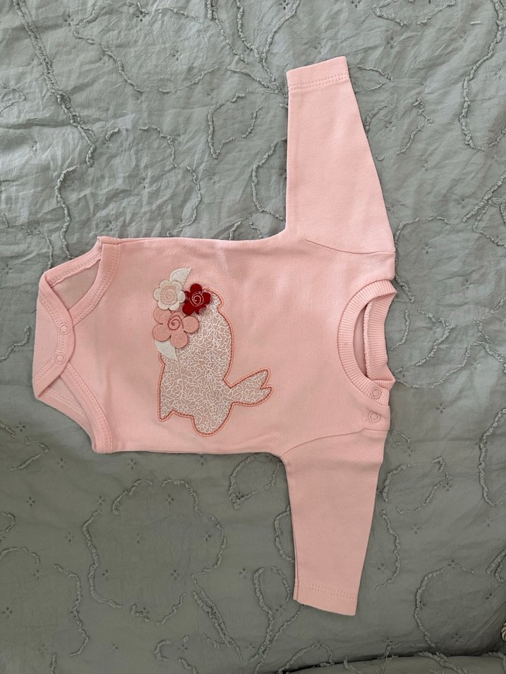Pastel pembe renkli, uzun kollu, yuvarlak yaka bebek body. Üzerinde nakış ve dantel çiçek detayları bulunur.