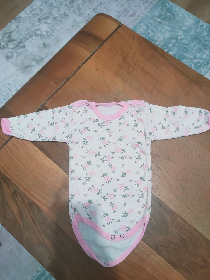 Uzun kollu, V yakalı ve pastel pembe çiçek desenli dantel detaylı bebek body. Kolay giydirme için çıtçıtlı kapanışa sahiptir.