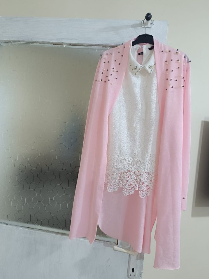 Pembe uzun kollu kadın bluz, dantel detaylı ve rahat kesimli, yumuşak örme kumaştan günlük kullanım için uygundur.