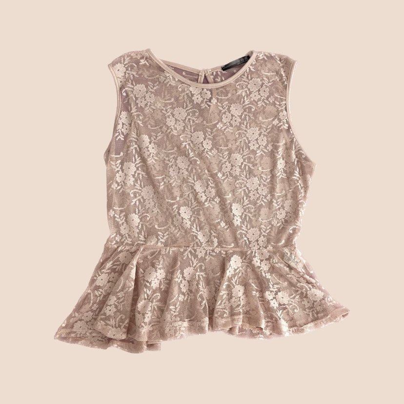 dantel detaylı, kolsuz ve belden oturan pembe bluz, peplum etek ucu ile klasik bohem tarz sunar. günlük kullanıma uygundur