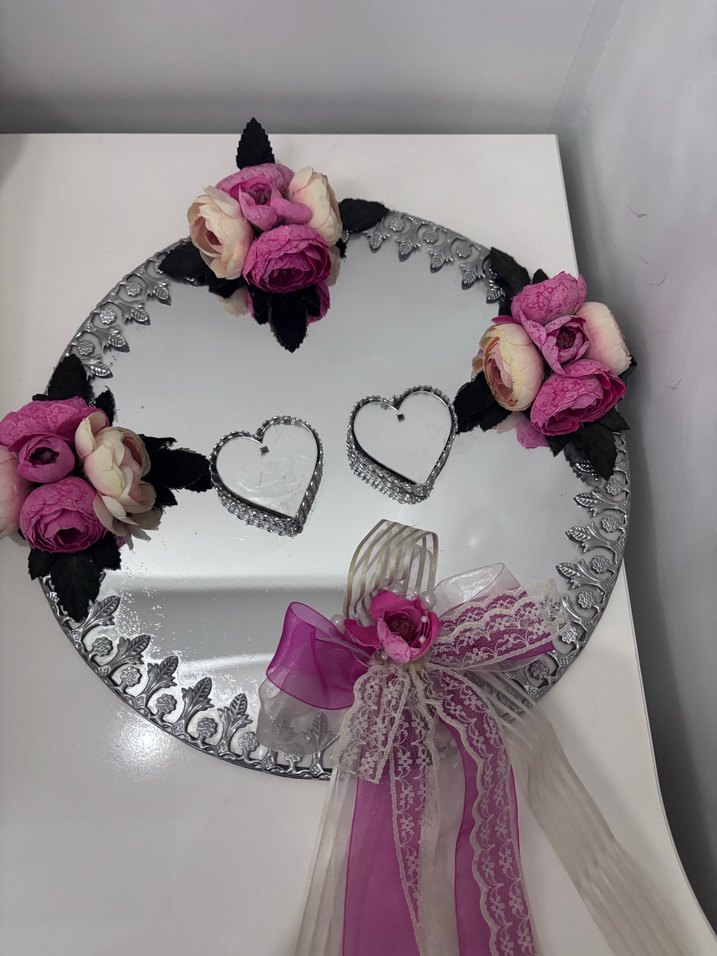 Dantel detaylı yuvarlak vintage tarzda ayna, pembe çiçek süslemeleri, iki kalp şekilli aksesuar ve pembe kurdele fiyonk ile tamamlanmıştır.