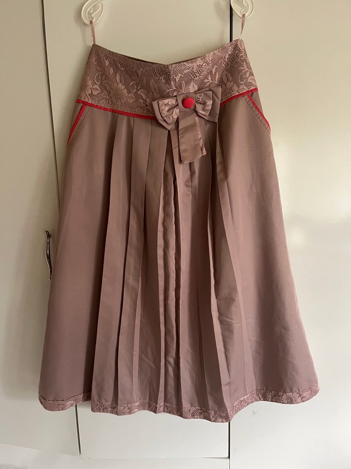 Gül kurusu ve pembe renkte, ipeksi kumaştan, dantel detaylı ve fiyonk süslemeli pilili etek, rahat kesim, ofis kullanımı için uygun.