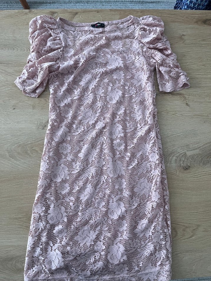 Pudra renginde, dantel kumaştan yapılmış, kısa kollu ve V yakalı, vücuda oturan midi elbise.