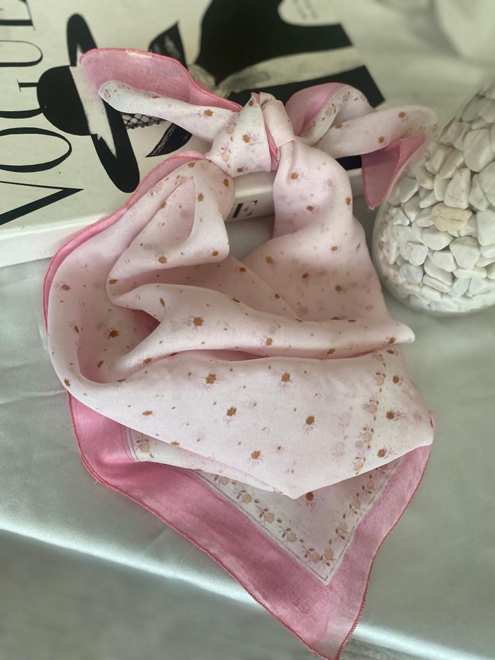 Pastel pembe renkte, dantel detaylı ve ipeksi dokulu, bohem ve retro Paris tarzını yansıtan kadın fuları.