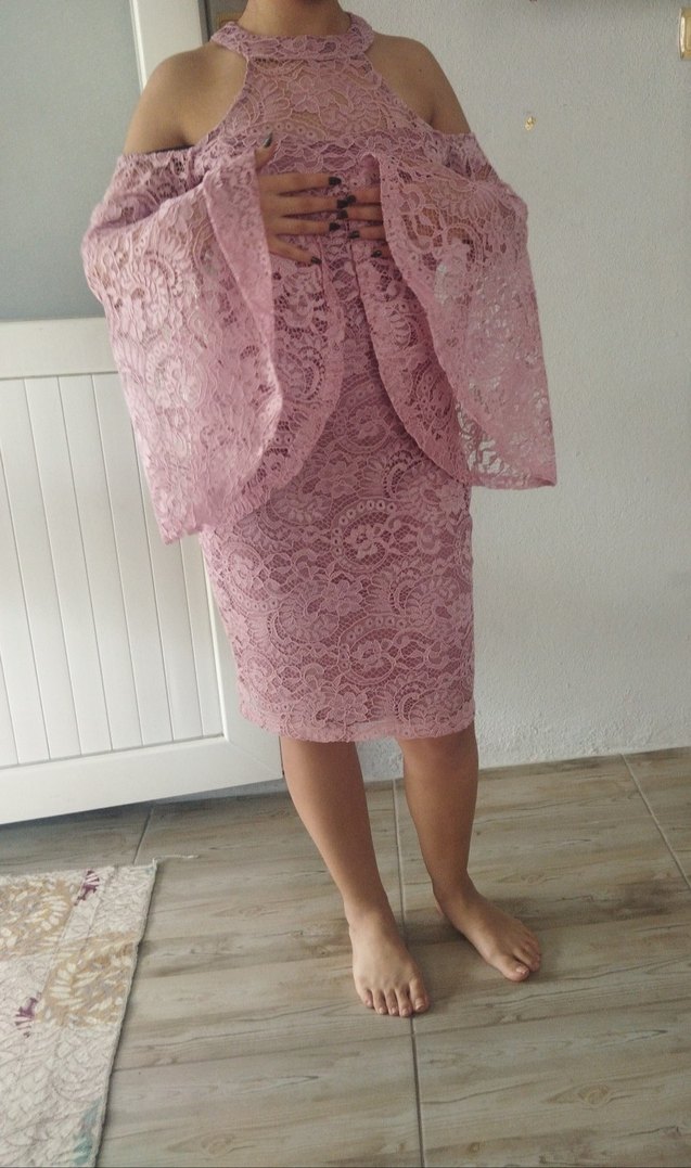 Pudra pembesi dantel detaylı, midi boy, vücuda oturan klasik şıklık ve bohem tarzıyla düğünler için uygundur.