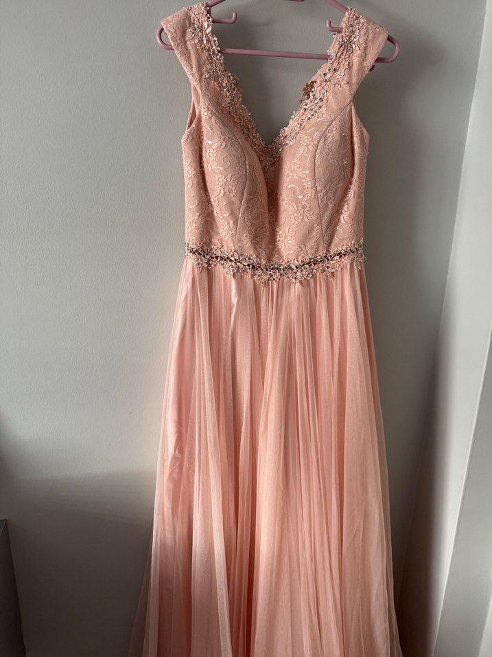 V yaka ve kolsuz tasarıma sahip, dantel detaylı, pudra pembe uzun abiye elbise. Düğünler için uygun, modern klasik stil.