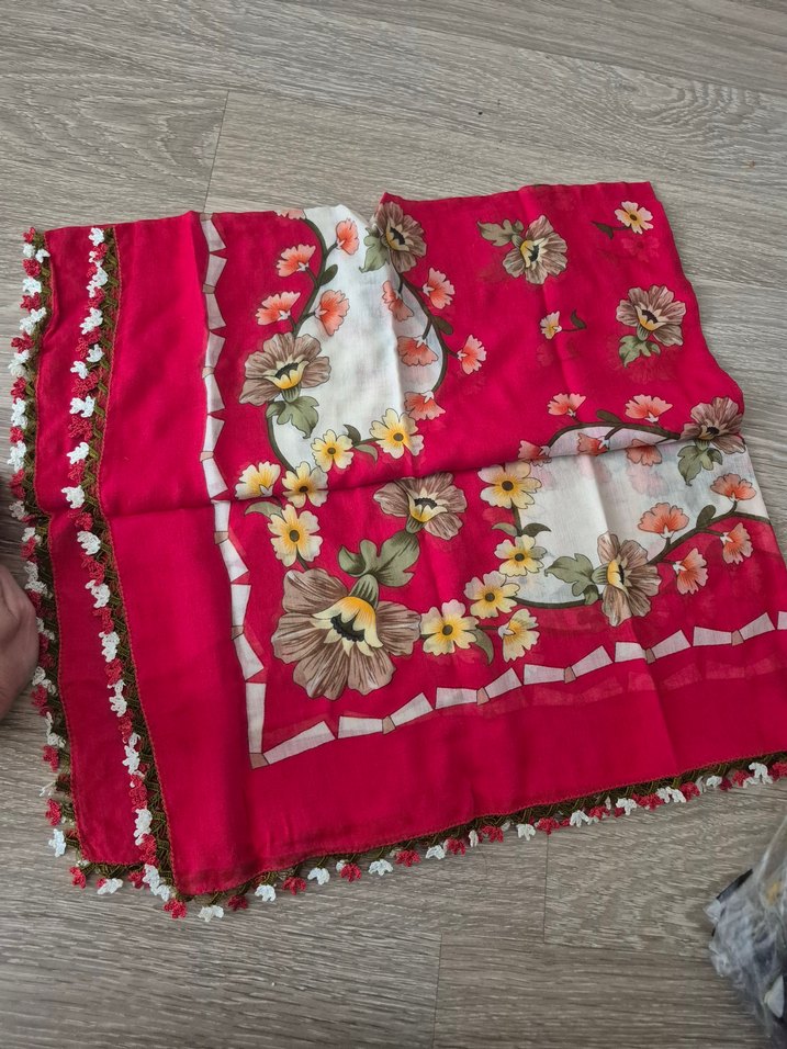 Renkli çiçek desenli, dantel detaylı kırmızı, ipeksi dokulu bohem kadın fuları.