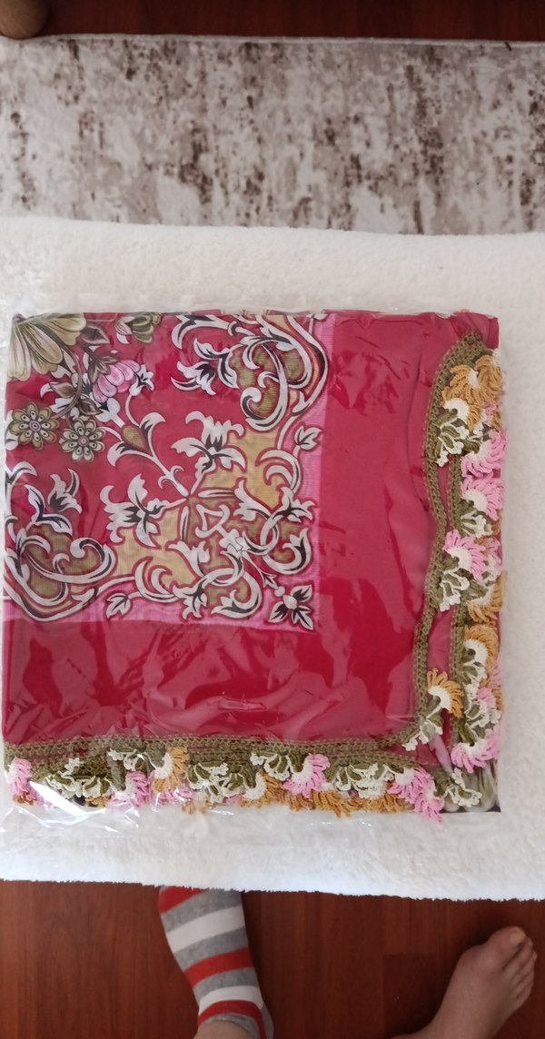 Yumuşak sentetik kumaştan, bohem esintili çiçek desenli, dantel kenarlı renkli kadın şalı.