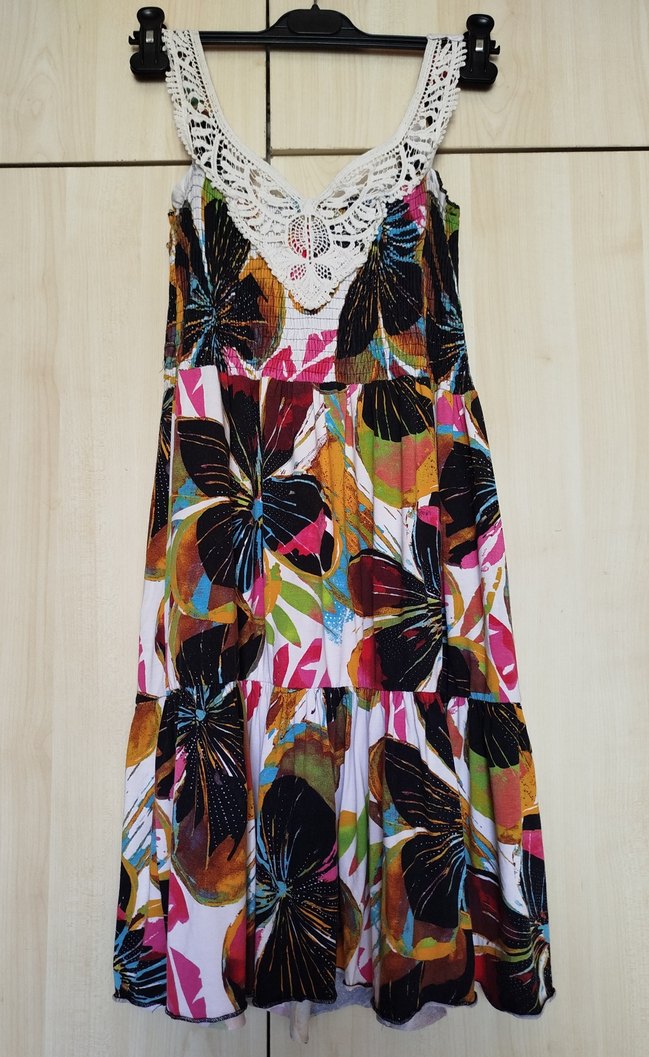 Dantel V yaka ve renkli batik desenli, kolsuz uzun elbise. Yumuşak sentetik kumaştan, rahat kalıp sunar. Günlük kullanıma uygun bohem tarzda.