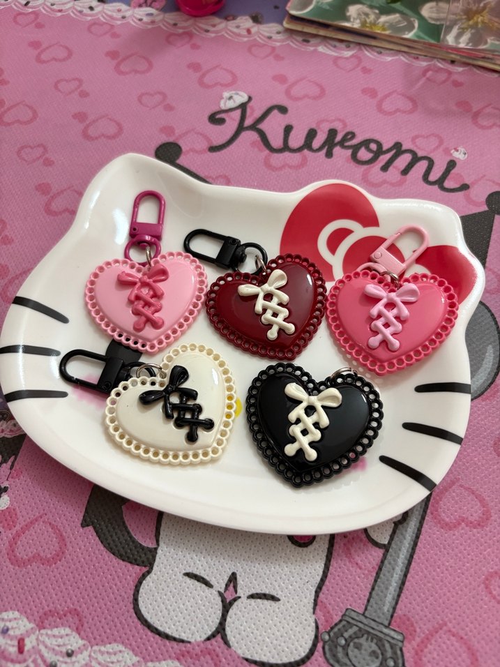 Pembe, kırmızı, beyaz ve siyah renklerde dantel detaylı gotik tarz kalp anahtarlık seti. Parisian bohem ve retro esintiler taşır.