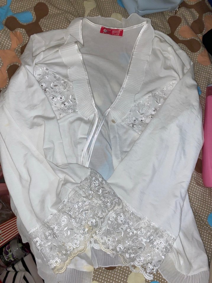 Hiç giyilmedi Beyaz renkte, uzun kollu ve V yaka kadın gömleği, nakışlı dantel detaylarına sahiptir. Yumuşak keten kumaştan, bol kesim ve midi boydadır, bohem vintage tarzına uygundur.