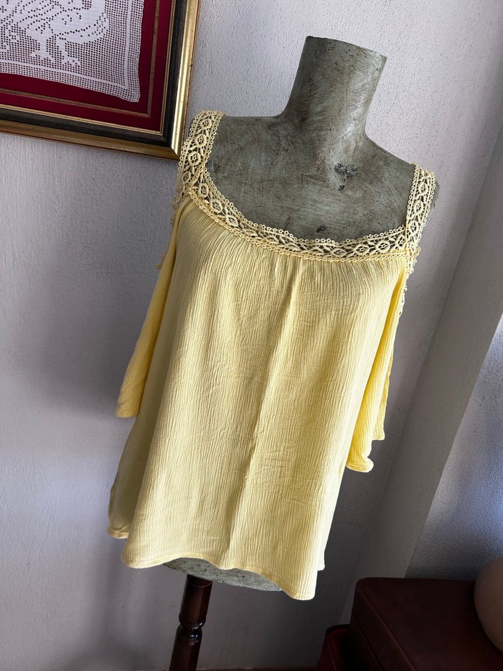 Bürümcük gibi bir kumaşı var, hafif ve dökümlü. Yaka ve omuz dantel detaylı, bir-iki defa giyilmiş bir bluz. Hoş bir şey.
