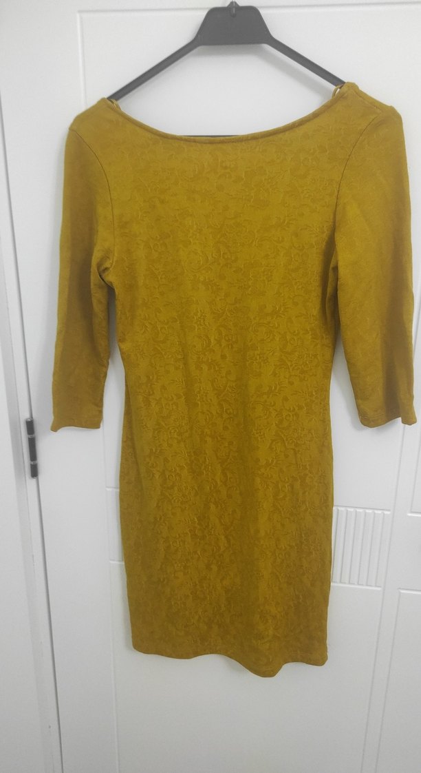 Dantel detaylı, uzun kollu sarı triko elbise. Yumuşak keten kumaştan, bohem vintage tarzında, ofis kullanımı için uygun.İki kere kullanıldı