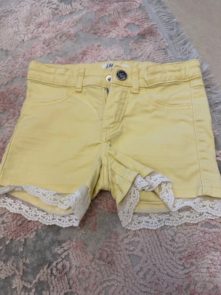 Nakışlı desenli, dantel detaylı, pastel sarı pamuklu, vücuda oturan kız çocuk şortu.