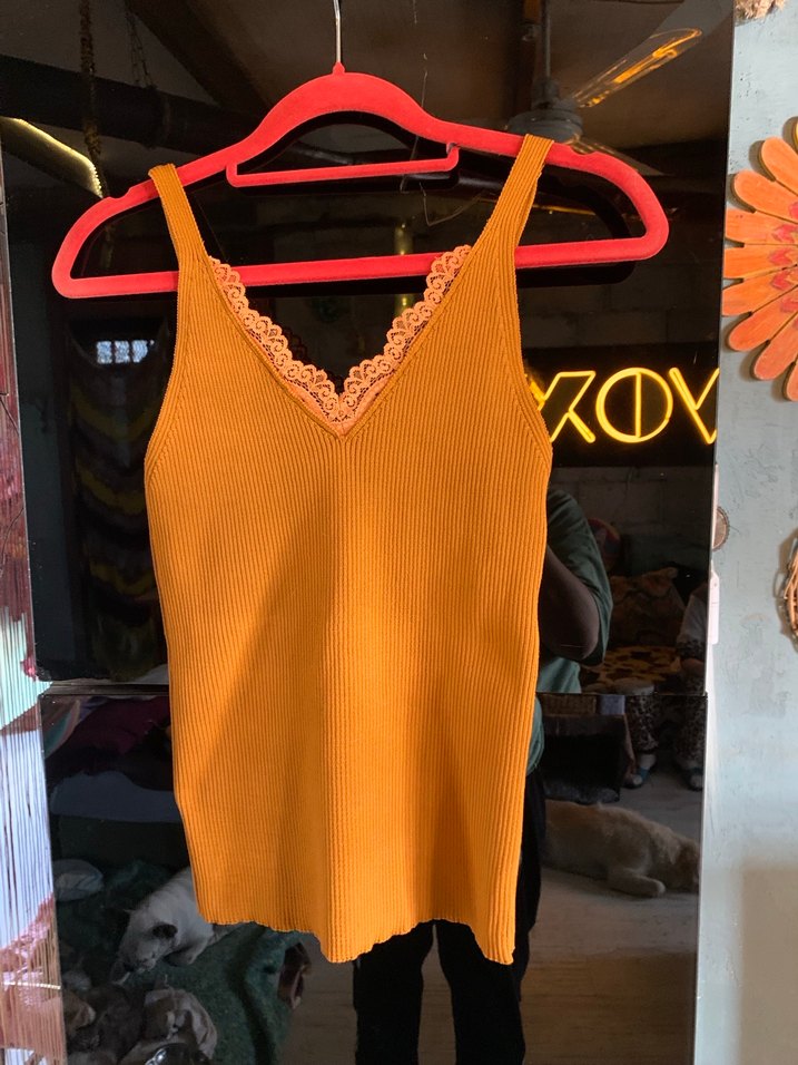 Dantel detaylı V yaka, sarı renkli, ince örme kumaştan yapılmış, kolsuz ve midi boyda, dar kesim bir atlet.