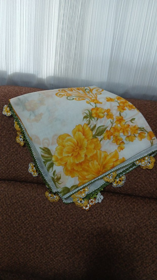 Sarı çiçek desenli, dantel detaylı kadınyazması el emeği bu eşarp da bir kaç leke var hiç yıkamadım ama geçecek gibi bir leke