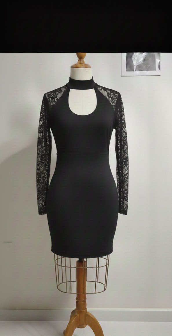 Dantel detaylı, siyah, balıkçı yaka ve uzun kollu, vücuda oturan midi elbisedir. Günlük kullanıma uygundur.