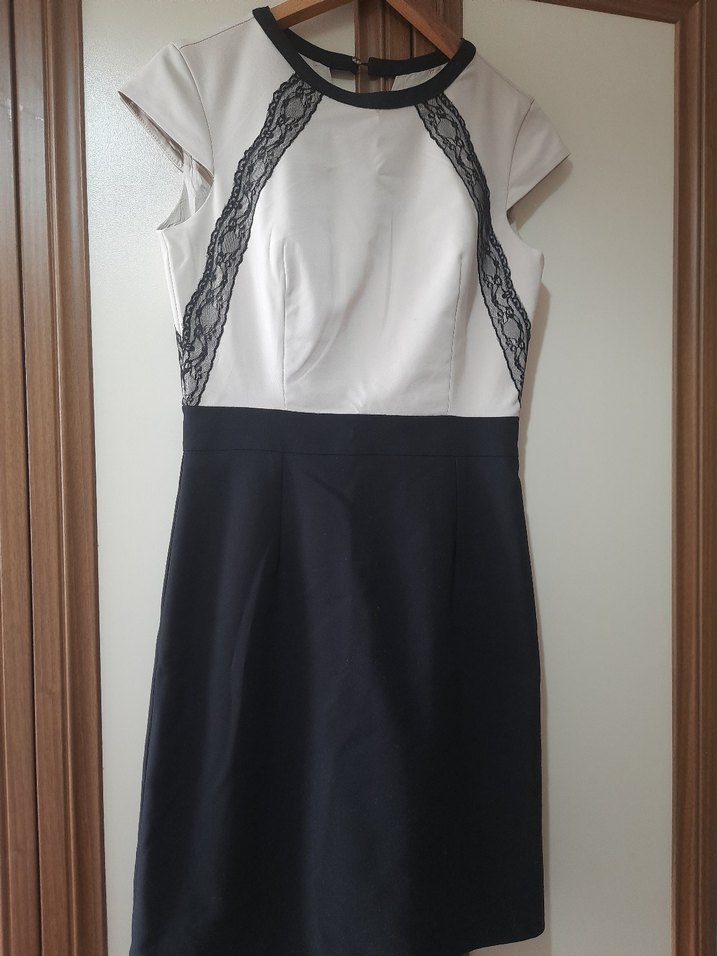 Fitted kesim midi elbise, beyaz üst kısmında siyah dantel detayları ve siyah etek kısmı ile modern klasik tarzda, ofis için uygun kolsuz model.