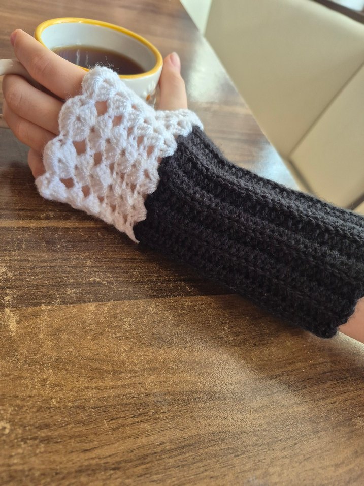 Siyah örgü eldivenler, beyaz dantel manşetlerle birlikte rahat ve gotik tarz sunar. Yumuşak örgü dokusu ve ince dantel detaylarıyla dikkat çeker.