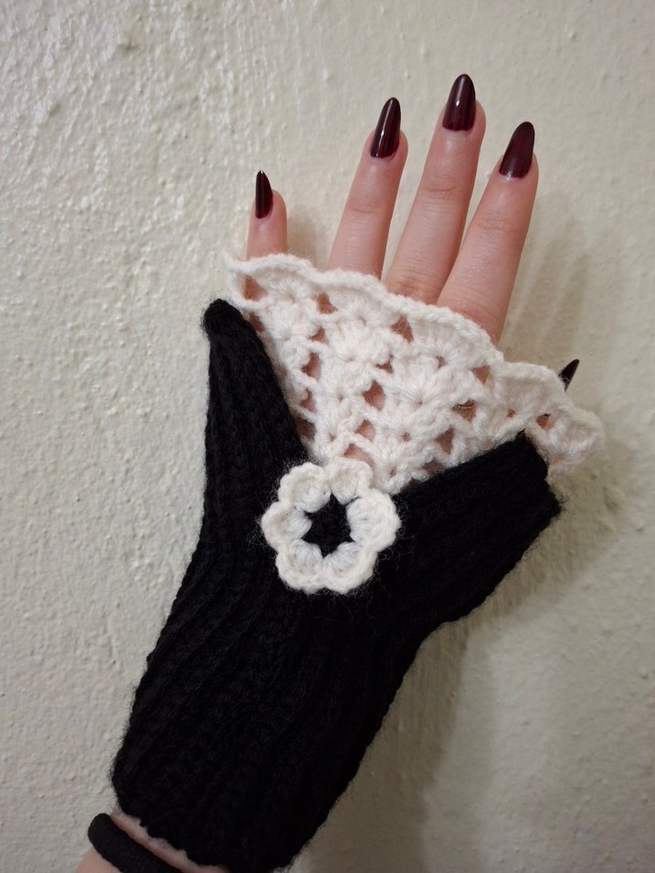 Kadınlar için siyah örgü ve beyaz dantel detaylı eldivenler. Rahat, nostaljik gotik tarzda, dantel çiçek süslemeli ve parmakları açık tasarım.