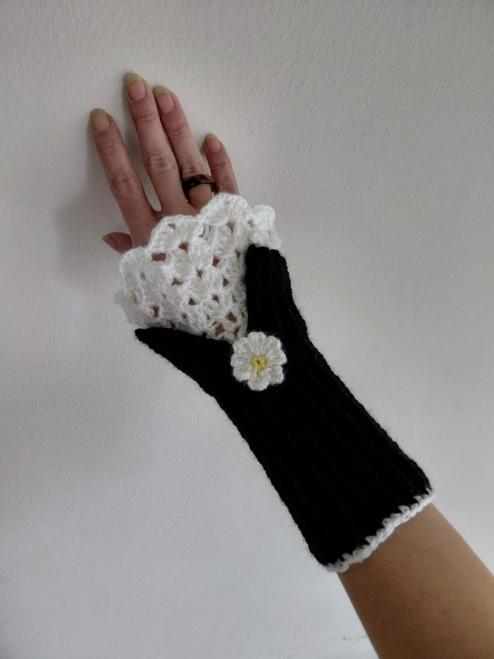 Kadınlar için siyah örme eldivenler, beyaz dantel detayları ve küçük çiçek süsü ile vintage gotik tarzını yansıtıyor.
