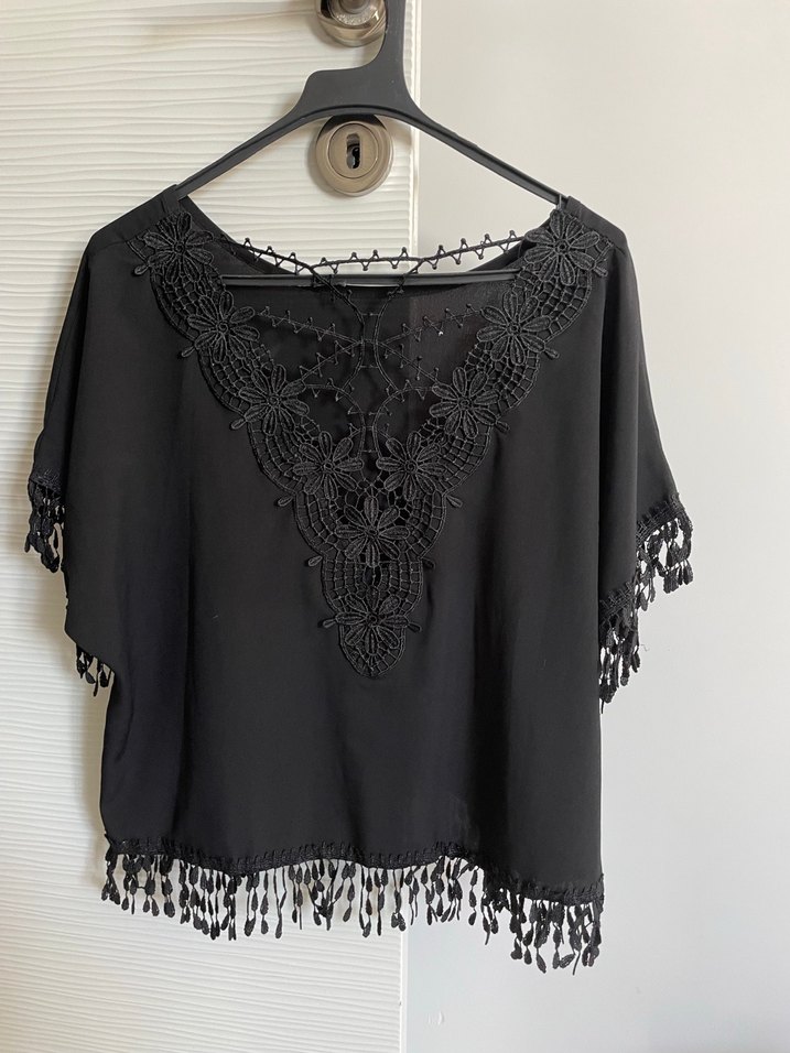 V yakalı, dantel işlemeli, kısa kollu, salaş kesim siyah bluz. Etek ucu ve kol uçlarında püskül detayları bulunur. Bohem tarz için uygun.